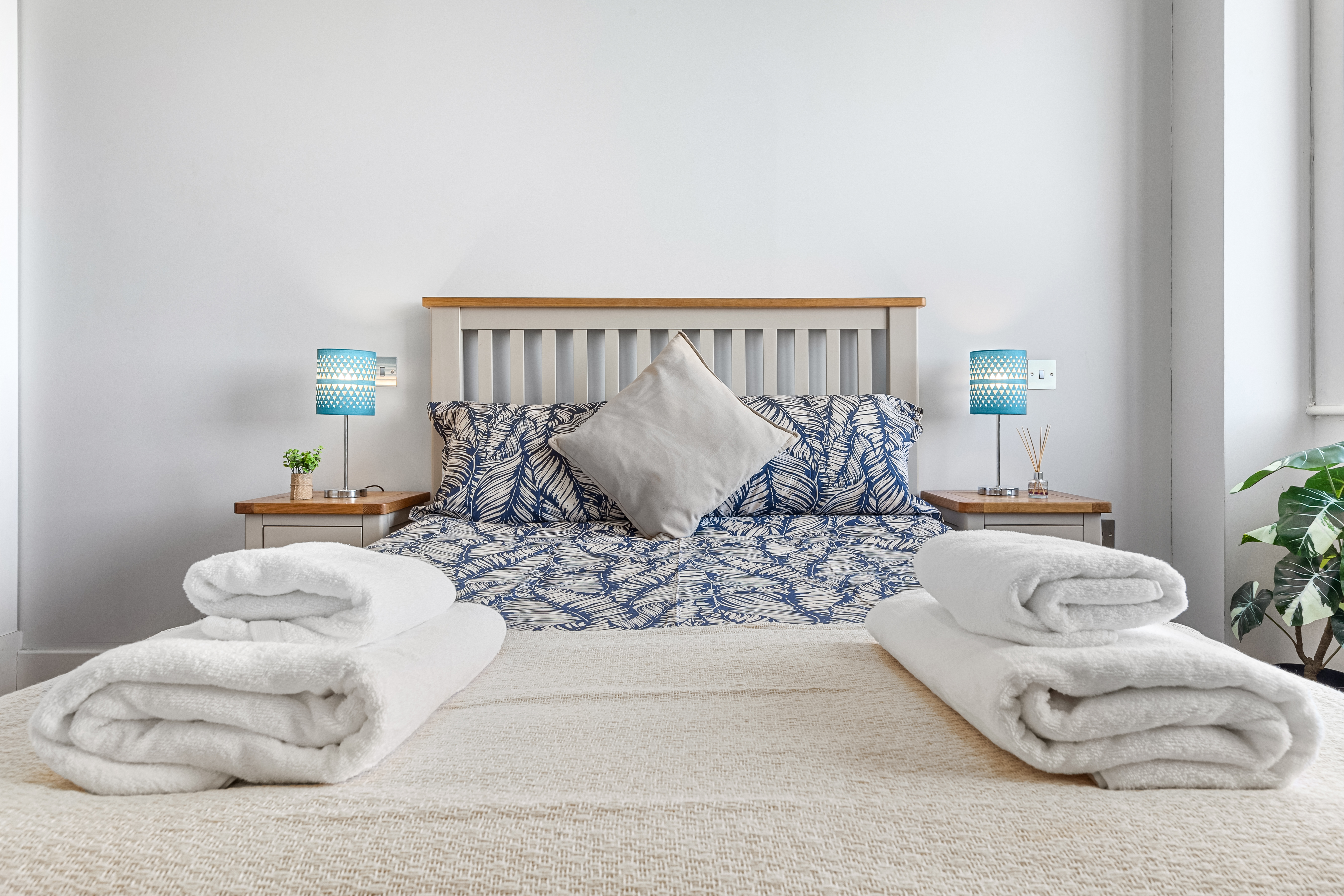 Beyond the main living area, you'll find two well-appointed bedrooms designed with comfort in mind—complete with plush bedding and a relaxing atmosphere, perfect for unwinding after a day of exploring the city.